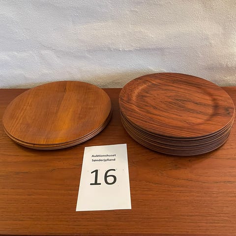 Dækketallerknerne er fra 1960’erne og er udført af formpresset teaktræ. De er ret tynde, meget flade og lave.
