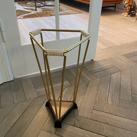 Paraplyholder fra 1960'erne med støbejernsfod, messing ramme og guldsnore.