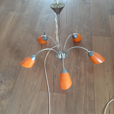 Loftslampe i krom med 5 arme og fatninger, hvorpå der er monteret 5 paddehat formede glaskupler.