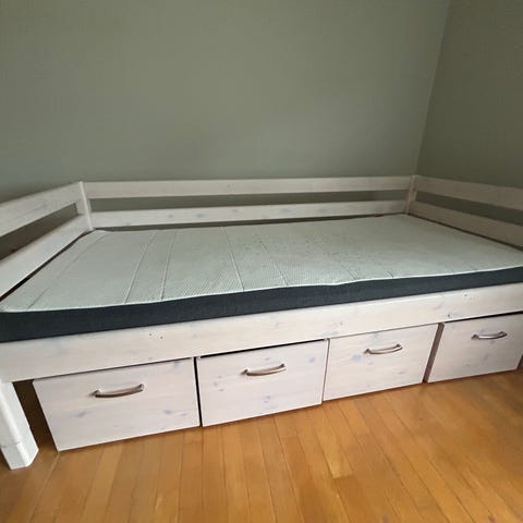 Flexa White enkelt seng, 90x200, dvs seng måler 210 x 101 x 66,5. Sælges meget billigt da vi gerne vil af med den hurtigt. Nypris 2999 kr. næsten ny madras kan medfølge for 100 kr. Skuffer følger ikke med.