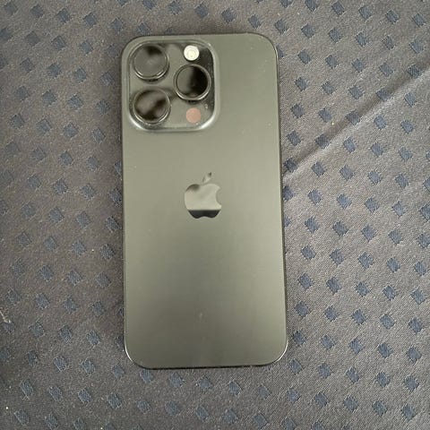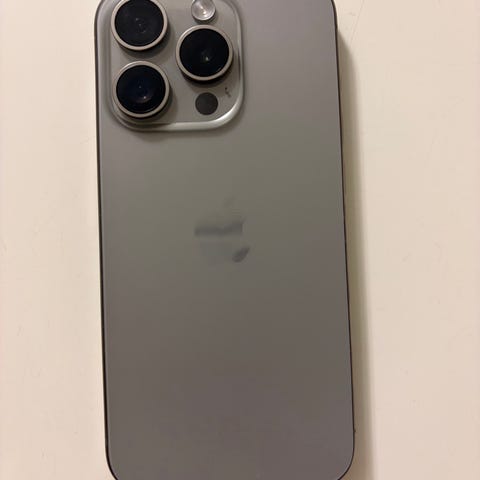Apple iPhone 15 Pro white titaniun smartphone med 128 GB intern hukommelse. Modellen har tredobbelt kamera på bagsiden og frontkamera i skærmen. Kabinettet fremstår i en lys sølvfarve med flade kanter. Leveres i original emballage med SIM-nål som vist på billederne. Egnet til almindelig daglig brug, apps, streaming og foto/videooptagelse.