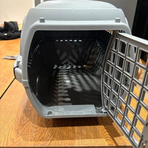 Transportkasse til kæledyr i hård plast i grå nuancer. Kassen har ventilationsåbninger i siderne og frontlåge i metalgitter, som kan tages af. Egnet til transport af mindre hunde eller katte i bil eller til dyrlægebesøg. Indersiden er glat og nem at rengøre. Kassen har bærehåndtag i toppen for lettere håndtering.