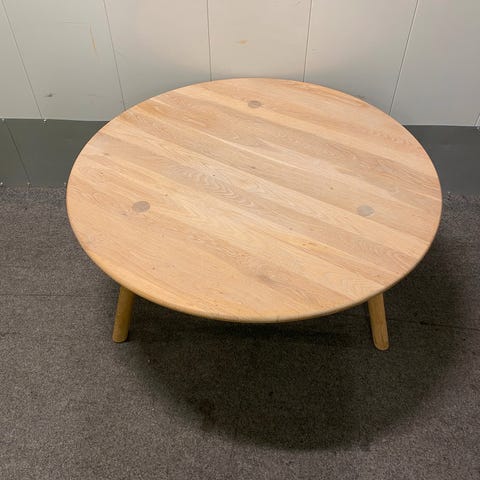 Ny slebet og olieret massiv egetræs sofabord med klap funktion , så der både kan bruges som et rundt bord med en diameter på 63 cm , og en højde på 51 cm , og et rektangulært bord på 63 cm x 30 cm og 51 cm i højden