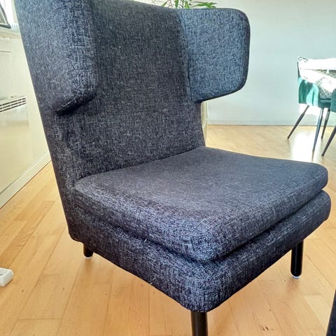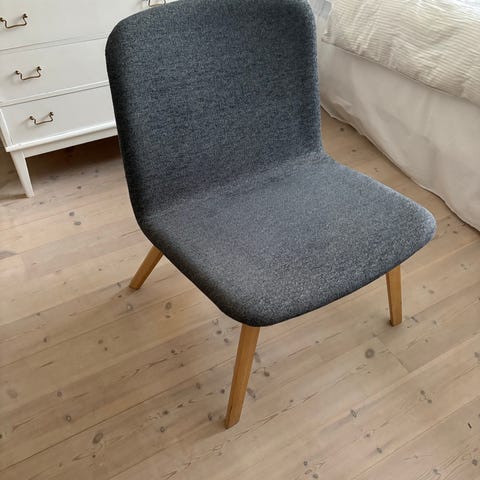 Virkelig fin lænestol fra Bolia i gråmeleret stof. Der er mindre brugsspor, som er vist på billederne.