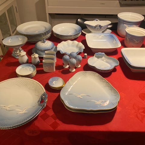 Mågestel, kaffestel til 17 personer, dog 19 kagetallerken, 2 kaffekander (1 uden låg), obs skår på to genstande.