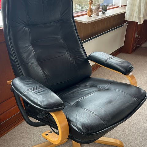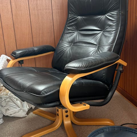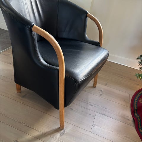Har 2 andre sorte læder lænestole i samme stil, samt 2 skamler. Alt kan købes samlet for en aftalt pris.