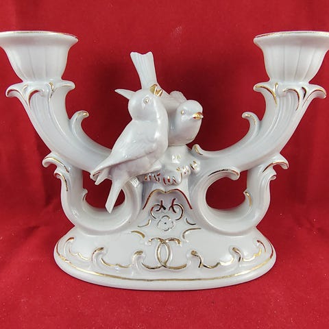 Lysestage i rokokostil til 2 lys. Hvid porcelæn med guld kanter og fløjte. Schaubach kunst. Købt hos Lillelund Jensen i Aarhus. Yderst pæn stand med ganske få brugsspor.