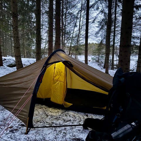 Teltet er købt hos Bjergkæden i juni 2024 og har været slået op maks 10 gange og er derfor i rigtig flot stand. De eneste tydelige brugsspor er på pløkkerne og lidt slidtage på opbevaringsposen.