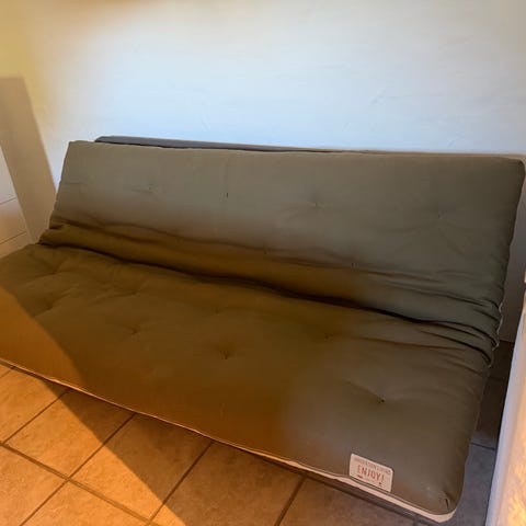 Metal sofa-bed frame with wooden slats. Converts easily from sofa to bed. Sturdy, comfortable, and in good working condition. Ideal for guest room or small space.