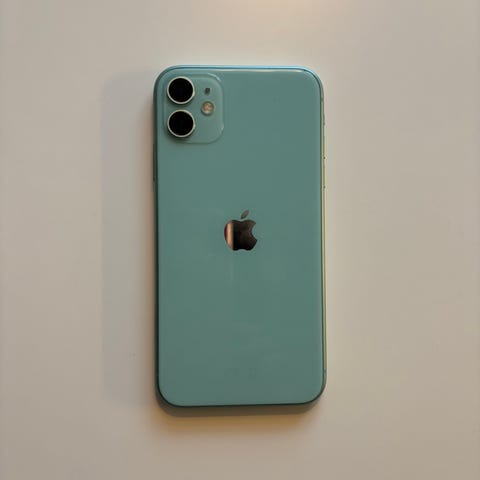 Apple iPhone 11 smartphone med 64 GB intern hukommelse. Telefonen fremstår i sort farve. Modellen har dual‑kamera på bagsiden og fuldskærmsdisplay på forsiden. Egnede funktioner omfatter almindelig daglig brug som opkald, beskeder, internet, apps og foto/video. Billederne viser telefonens udseende for- og bagside samt et separat cover med slange-motiv, som eventuelt kan medfølge efter aftale.