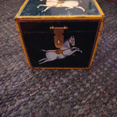 Oval trææske med bemalet dekoration på sider og låg. Æsken har låg med motiv og mønstrede cirkler langs kanten. Velegnet som opbevaringsæske eller dekoration i hjemmet.