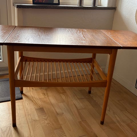 Trebenet sofabord i flot valnød. Produceret hos Anton Kildeberg som Finn Juhl også har tegnet nogle borde for. Finéren er flot og flammet, den kehlede kant er en god detalje og så har bordet masser af charme og glød