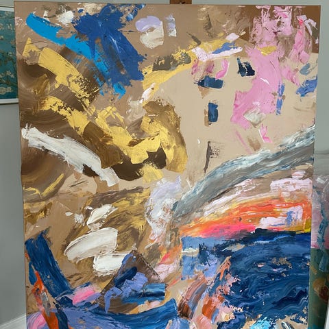 Abstrakt maleri på lærred 100x100 Maleriet har et ekspressivt, non-figurativt udtryk med synlige penselstrøg og lag af farver.