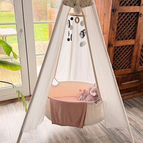 Leander vugge i tekstil med trebenet stativ. Den har fungeret helt som den skulle, men da vi ikke får brugt den så meget som tiltænkt, synes vi at den skal have sig et nyt hjem.