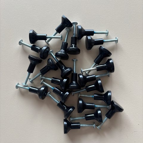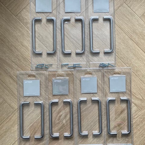 IKEA BAGGANÄS greb sæt i metal. Pakkerne indeholder greb med tilhørende skruer til montering på skabe eller skuffer. Velegnet til brug i køkken, bad eller andre møbler, hvor der ønskes en enkel og neutral metalgrebsløsning.