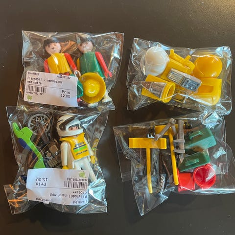 Playmobil 34 figurer og masser af tilbehør. Langt det meste er fra 1970’erne. Sættet omfatter de 34 figurer, en hest samt diverse tilbehørsdele som vogne, bårer, våben, hatte, hjelme, kroner, skåle, skiver, geværer, håndjern, værktøj, kapper, krykker, walkie talkies, kandelaber, hospitalsenge, operationsbord, tronstol og mange andre smådele. Der indgår blandt andet figurer i uniformer, western- og indianerfigurer samt andre tematiserede figurer. Samlingen kan bruges til leg, supplering af eksisterende Playmobil-sæt eller som reservedele. Der er foto af originale kasser, men de enkelte sæt er ikke komplette.
