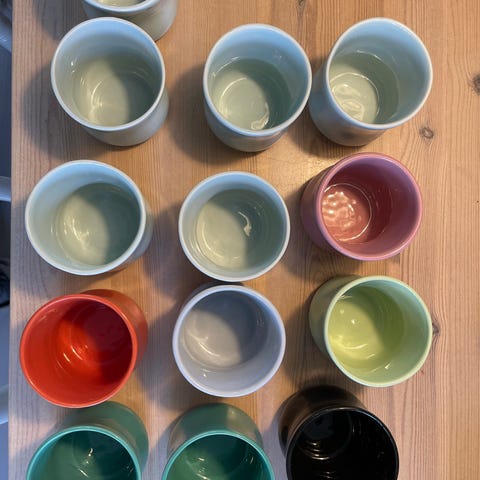 Kähler mano kopper/krus i keramik i forskellige farver. Sættet består af fire kopper i lilla, lysegul, lysblå og ferskenfarvet glasur. Kopperne har en blød, rund form med let udadbøjet kant. Velegnet til servering af varme og kolde drikke i køkken eller stue. Bundene er mærket med Kähler-logo. Lilla har slag (se billede).