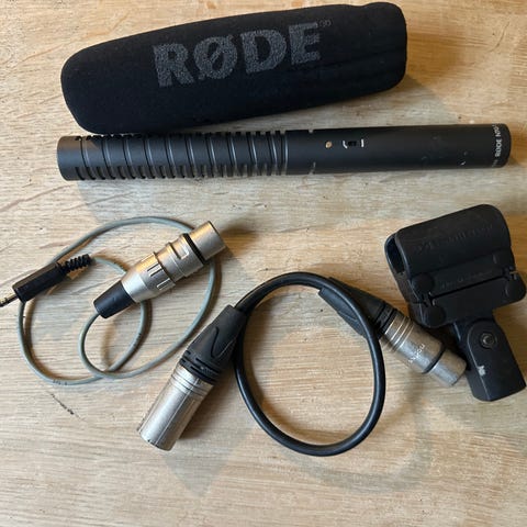 Købt i 2014 - pris 2200 kr. Det du ser på billedet, er hvad jeg har tilbage af RØDE-udstyret. Den har ligget gemt væk i aluminiumsrøret i mange år, og har kun været brugt til tre produktioner. Har måske samlet set brugt den 15 timer i alt. Ellers har den altid ligget i aluminiumsrøret.