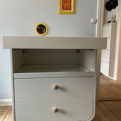 Fint DIY puslebord med afsavede ben, så det passer perfekt i højden, når man skifter ble. Har været tryg base ved bleskift for to babyer, og nu skal det videre til en ny familie. Vi har selv slebet, malet i beige og skiftet grebene på en IKEA-kommode, sat mdf på toppen, så den passer perfekt til fx Leander puslepude. Den kan evt tilkøbes. Der er selvfølgelig brugsspor hist og her, men fremstår ellers fin. Mål: B 80, H 83/93, D 47/63.