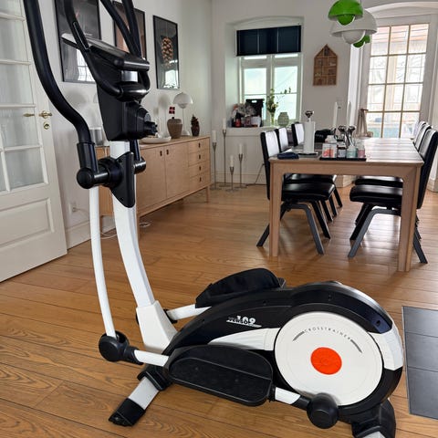 Kettler crosstrainer i sort og hvid. Maskinen har elektronisk display med visning af blandt andet tid, distance, hastighed og kalorieforbrug samt betjeningsknapper til valg af programmer og indstillinger. Udstyret med faste og bevægelige håndtag samt brede pedaler for stabil træning. Velegnet til konditions- og kredsløbstræning i hjemmet.