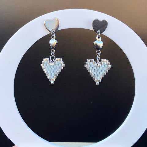 Vedhæng og øreringe/ørestikker med motiv af et fabeldyr der er i sarte pastelfarver. I noget metal og tror det enten er noget glas eller hårdt plastik det buer. Alder, oprindelse, materiale ukendt.