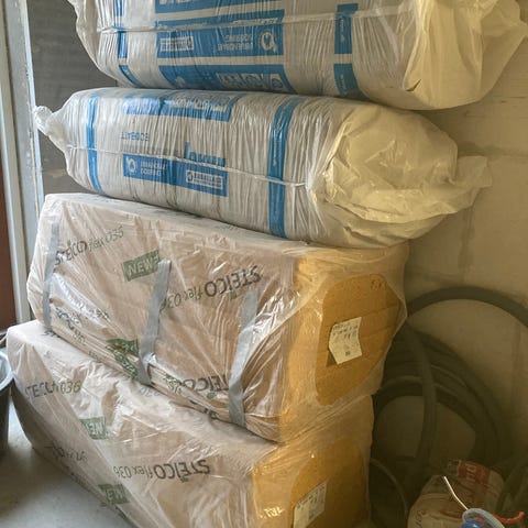 Ny træfiberisolering - brugt halvanden måtte. Der er 8 stk tilbage. Vi har også et par poser med rester af forskellig størrelse man kan få med.
