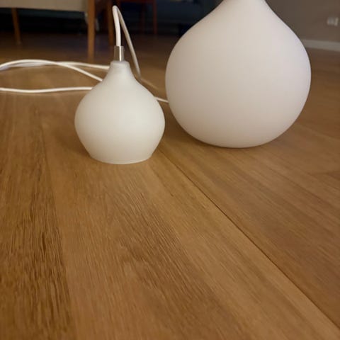Sælger disse smukke og dekorative pendellamper med perler. Lamperne er udført i metaltråd med fine hvide perler, som giver et elegant og let udtryk. De skaber et hyggeligt og stemningsfuldt lys og passer perfekt over spisebordet, i stuen, soveværelset eller entréen.
