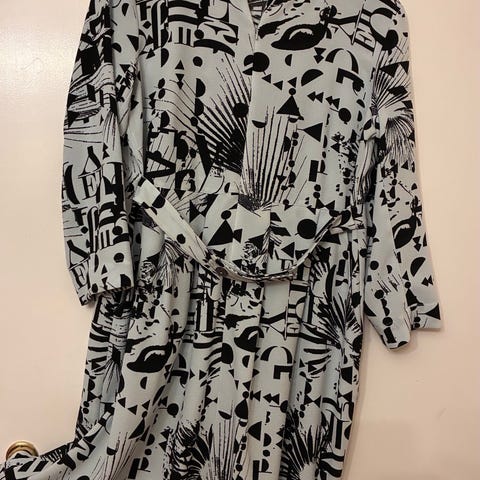 Bitte Kai Rand hverdagskjole i sort viskose i størrelse M. Kjolen har et grafisk mønster i lys kontrastfarve og er syet i et blødt, vævet materiale af viskose. Modellen har lange ærmer og en løs, behagelig pasform, velegnet som hverdagskjole til kvinder. Designet fremstår enkelt med rund hals og et mønster, der går igen på hele kjolen.