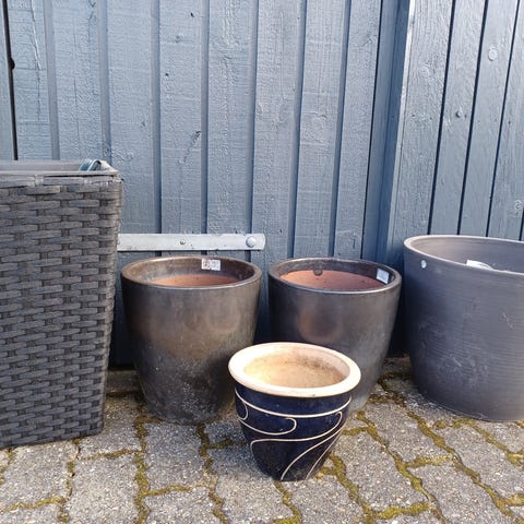 Krukker grå plast flet, Blommor fra JYSK stk. Pris 100,- .
