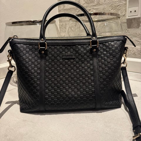 Tasken har klassisk Gucci-monogram på ydersiden kombineret med mørkebrune læderdetaljer. Skuldertaske med en bred rem i læder. Tasken lukkes med lynlås og har indvendigt rum med foret inderside samt lynlåslomme til mindre genstande. Velegnet til daglig brug, da den har god plads til hverdagsting som pung, nøgler, mobiltelefon og mindre personlige ejendele.