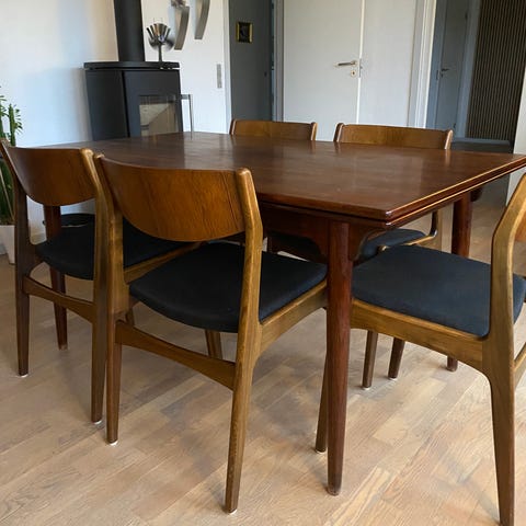 Palisander udtræksbord m. 4 palisander stole.