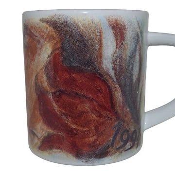 1994 Royal Copenhagen, kgl, årskrus, lille, designet af Bodil Kaalund, udført i fajance brun, grå og hvid, højde 7 cm.