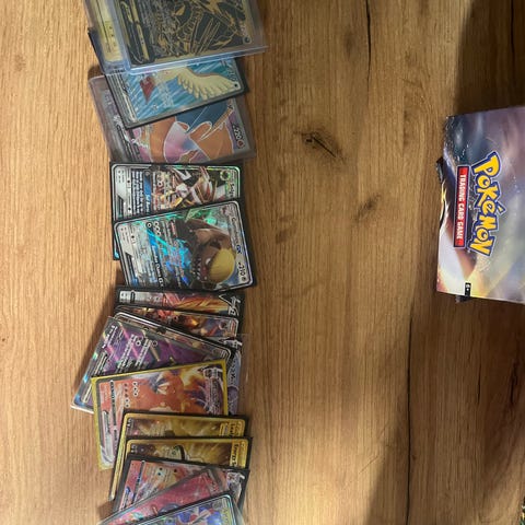 Pokémon samlekort med forskellige GX, EX, V og VMAX kort samt andre holo- og full art-kort. Kortene er fra flere forskellige sæt og serier og opbevares i plastlommer i en mappe. Velegnet til samlere af Pokémon TCG, der ønsker et udvalg af sjældne og glitrende kort til samling eller spil. Kortene kan købes enkelt og i flertal, bar skriv kort/kortene og ønskede pris, så kan vi finde ud af noget ud fra det