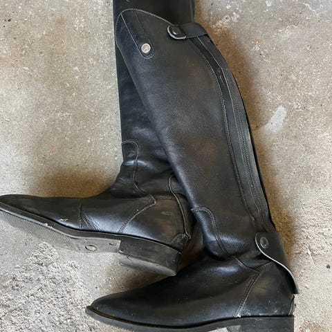Nye , har aldrig set en hest. Læder ridestøvler. Str 36. Passer læg 33cm og højde fra hæl til knæhase 48cm. Lidt overfladisk ridser, se billeder. Glitter top.