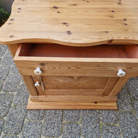Gammel servante/skab som er blevet slebet og malet lysegul. Den har et mærke efter en potteplante på den øverste plade.