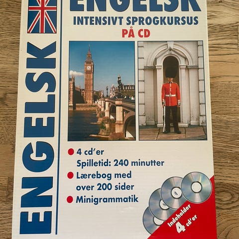 Intensivt sprogkursus på cd engelsk lærebog med cd. Materialet omfatter et kursus i engelsk med tilhørende cd’er med samlet spilletid på ca. 240 minutter, en lærebog på over 200 sider samt minigrammatik. Kurset er målrettet sprogindlæring i engelsk og kan anvendes til selvstudium eller som supplement til anden undervisning i faget sprog og ordbøger.
