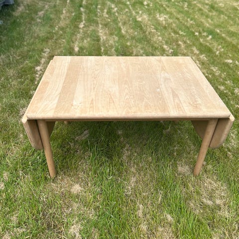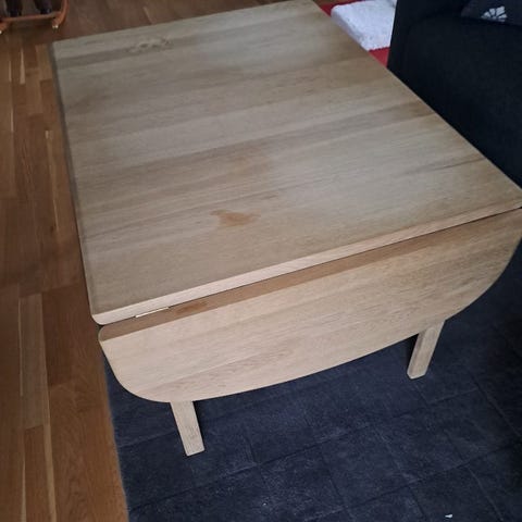 Bordet er i lyst træ, og har de karakteristiske to udslagsklapper, som gør bordet både fleksibelt og funktionelt. Perfekt som sofabord eller lille spise-/arbejdsplads.