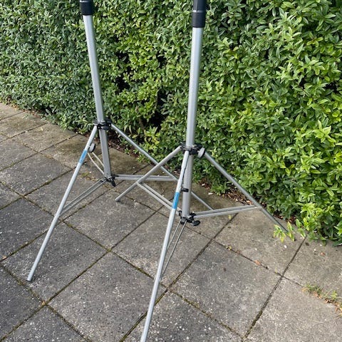 To ældre König & Meyer højtalerstativer. De er stadig solide, der er brugsspor på begge stativer, det ene mangler en original spændeskrue i stativet til højre.