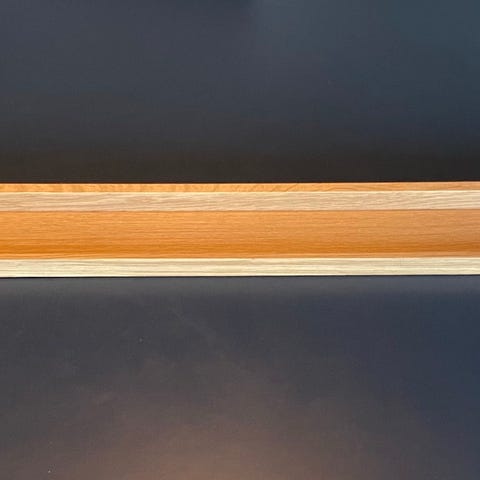 Hvid hylde fra trævarefabrikernes udsalg. Fremstår rigtig flot. Der er sat en lille hvid liste på, for at dække de ellers synlige beslag til ophæng.