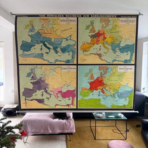 Gammelt skolekort med kort over Romerriget. Måler ca. 128 cm i bredden og 92 cm i højden. Kortet har forventelig patina, da det er et ældre skolekort – se billeder for detaljer.