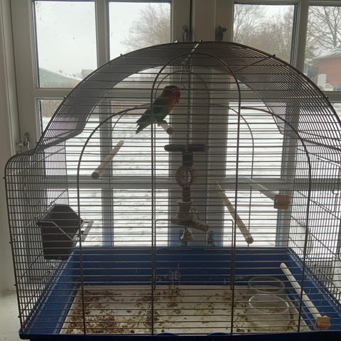 Han er ik tam men er kun 6 måneder så der masser af tid til at gøre ham tam han er sjov og rolig elsker snacks og kan sige av av av der følger lidt ting med til ham muligvis bur til 200