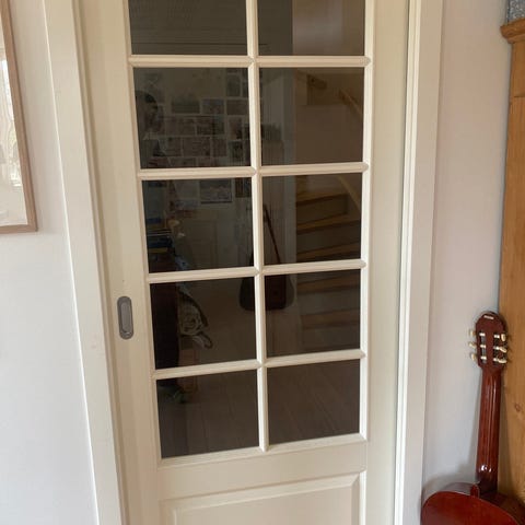 Flot og moderne Swedoor skydedør inkl. skinne og kappe. Døren har kun været sat op kort og er stort set ikke brugt – fremstår derfor som ny.