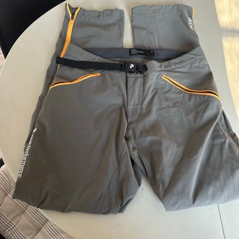 Peak Performance bukser til herre i størrelse S. Bukserne er i grå med sorte forstærkede felter. De er designet som funktionelle outdoor- eller fritidsbukser med flere syninger og paneler for bevægelsesfrihed. Materialet fremstår som let og slidstærkt, egnet til brug i naturen eller til hverdagsbrug i skiftende vejrforhold. Bukserne har bæltestropper og detaljer ved knæ og underben, som kan give ekstra holdbarhed ved aktivitet.