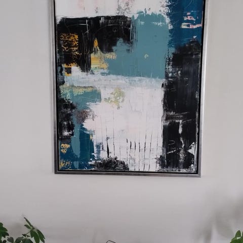 Abstrakt maleri på lærred i flerfarvet komposition med mørke og lyse nuancer, herunder rød, gul, hvid og sort. Maleriet fremstår som et non-figurativt værk med lag af struktur og penselstrøg. Signatur og årstal er anført på bagsiden af lærredet. Velegnet til ophængning i stue, kontor eller andre opholdsrum, hvor der ønskes et større, farverigt vægudtryk.