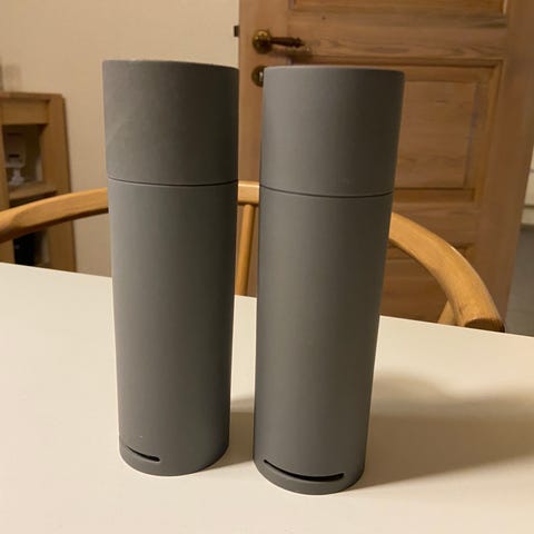 Zone lysegrå rund bakke med en diameter på 30 cm. Har brugsspor i form af "misfarvninger" og et lille hak (se billeder). Vi har haft brugt den i køkkenet, til at have salt-/peberkværn, olier osv. stående på og deraf misfarvningerne er kommet. Har kun været en tur i opvaskemaskinen, så måske knofedt kan fjerne nogle af misfarvningerne.