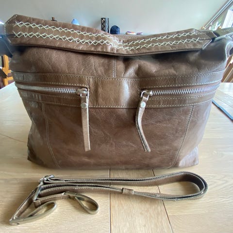 Tre indvendige rum, det ene med lynlås og et andet med lynlåsrum til pung og lomme til skriveredskaber og kort. Kraftigt for i nistret bomuld - det har lidt smuds øverst, der ikke er forsøgt fjernet.