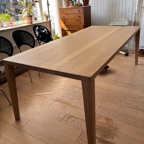 Jeg sælger dette lækre spisebord i massivt egetræ som står i rigtig fin stand. Det har været brugt som skrive- og spisebord i ikke-ryger hjem de seneste seks år og er nu klar til et nyt hjem. Det har været passet godt på, men der er dog en enkelt lille skramme som vist på billederne.