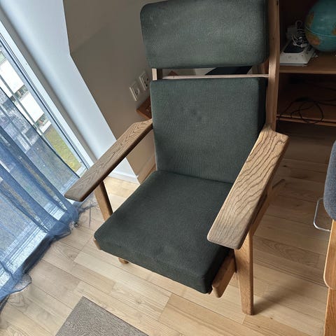 Hans J. Wegner lænestol høj ryg lys træ grå polstring