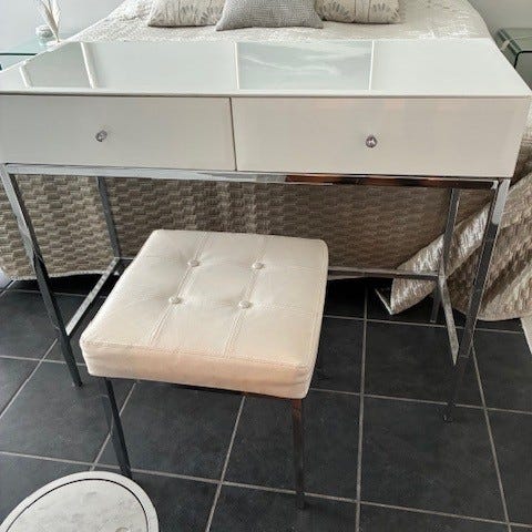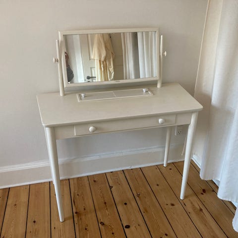 IKEA toiletbord med ovalt spejl i hvid. Bordet har en glasplade på bordpladen samt to små skuffer øverst og en større skuffe under bordpladen. Designet har buede ben og en klassisk stil, egnet som sminkebord eller arbejdsplads til personlig pleje og opbevaring af mindre genstande som makeup, smykker og tilbehør.