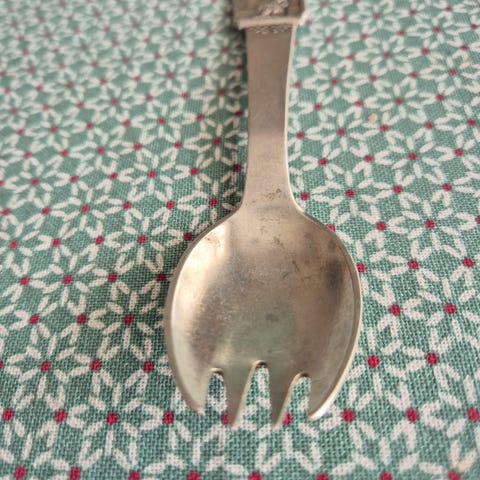 Gaffel, HS (Horsens Sølvvarefabrik, startede i år 1935 produktion af barnebestik med H C Andersen). motiv : "Den lille pige med svovlstikkerne"